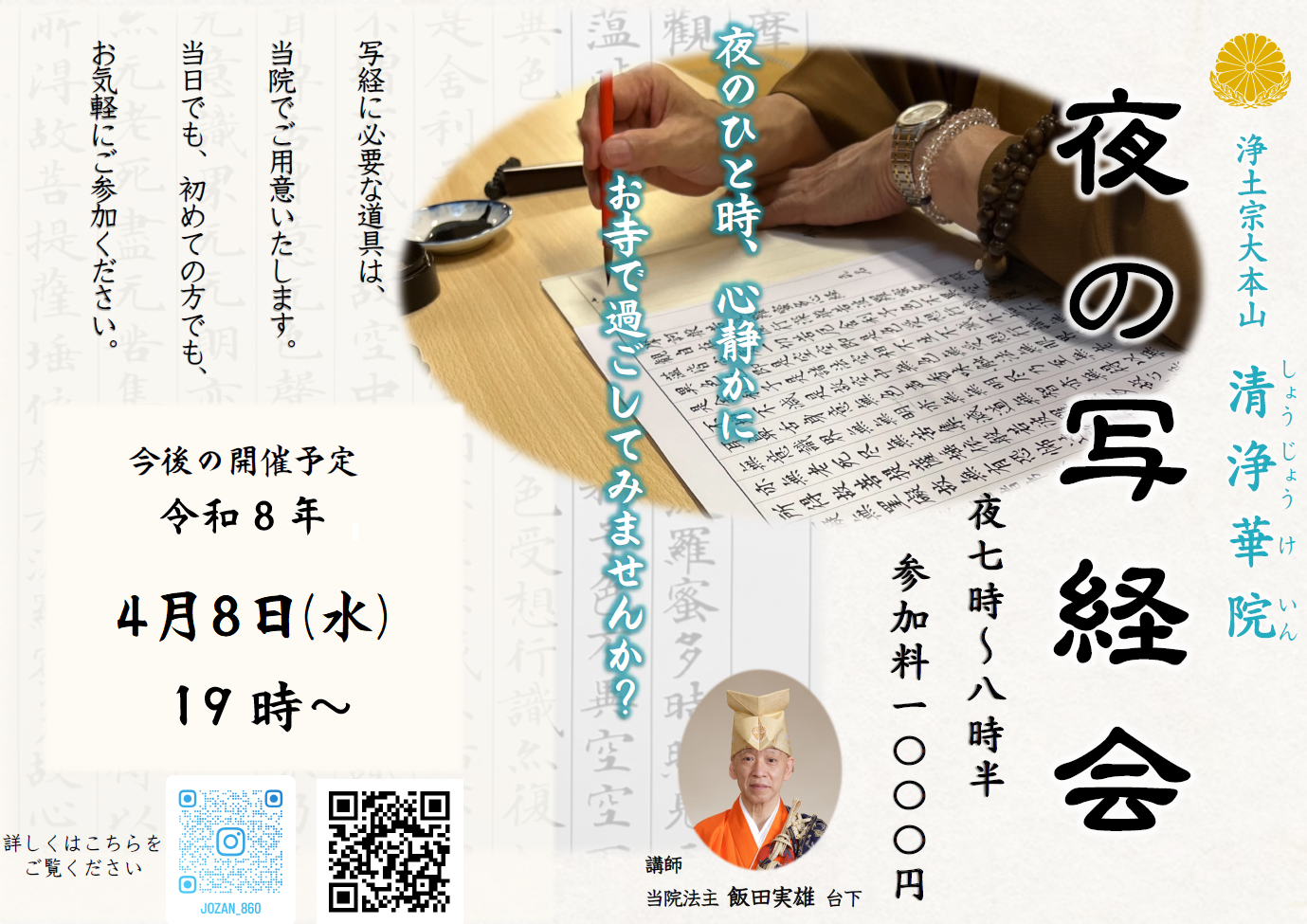 写経内容で若干長短がありますが、大体20時30分~45分頃に写経は終了します。しっかりとお勤めしますが、作法等は難しくありませんので、お気軽にご参加ください。